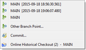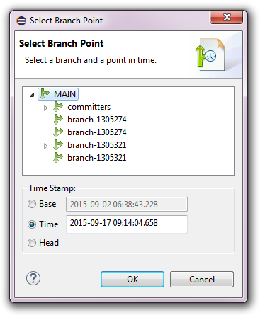 Online historical checkouts can be switched to any other branch point with the Switch To -> Other Branch Point context menu action. The Select Branch Point dialog (with a time stamp area) will pop up: