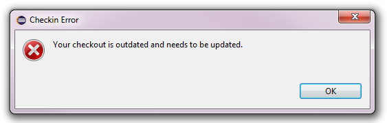 Checking in does not strictly require the local offline checkout to be up-to-date as long as the local changes and the remote changes are not conflicting (i.e., neither trivial nor non-trivial conflicts exist). If conflicts are detected during the check-in process the following dialog pops up, asking to update the checkout first: