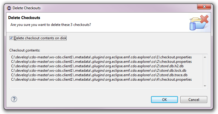 An existing checkout can be deleted by selecting that checkout and pressing the Del key or selecting the Delete action in the context menu. Several checkouts can be deleted at once. The following dialog will pop up: