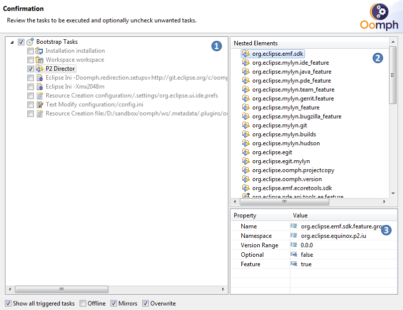 Displays the tasks to be performed. The root object shows the trigger that started the wizard. The check boxes allow tasks to be selectively chosen for execution. Double clicking a task will enable that task and disable all other tasks. The view can either show all tasks, including the ones that don't need to perform, or only the tasks that need to be performed. Tasks that don't need to perform are shown grayed out. Selecting a task will display its contained children in the nested elements viewer and will display its properties in the properties viewer.